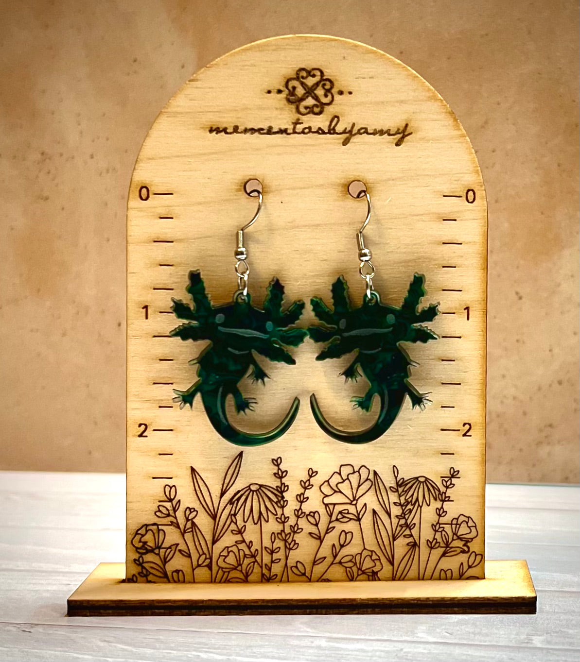 These stylish axolotl earrings feature a dangle design and are crafted from green and black swirl acrylic material. Enhance your style with these unique earrings, perfect for any reptile lover.