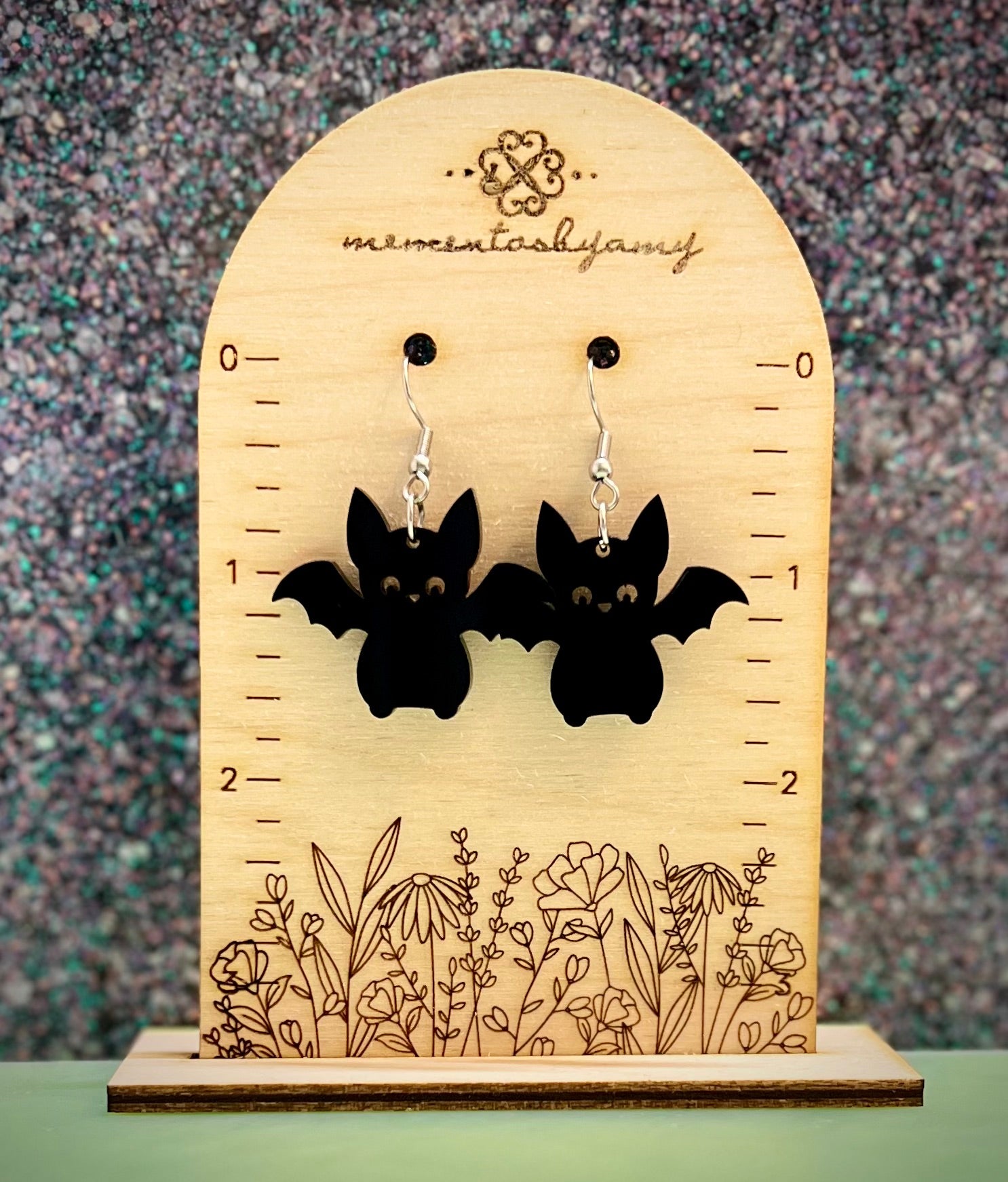 Oh so adorable black bat kitty earrings! Anyone that loves spooky season and black cats will find these hard to resist! Black acrylic with stainless steel ear wires.