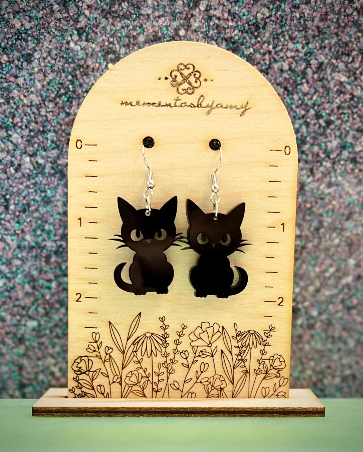 Cheeky black cat acrylic earrings with the cutest little whiskers! Stainless steel ear wires are used for those with sensitive ears.