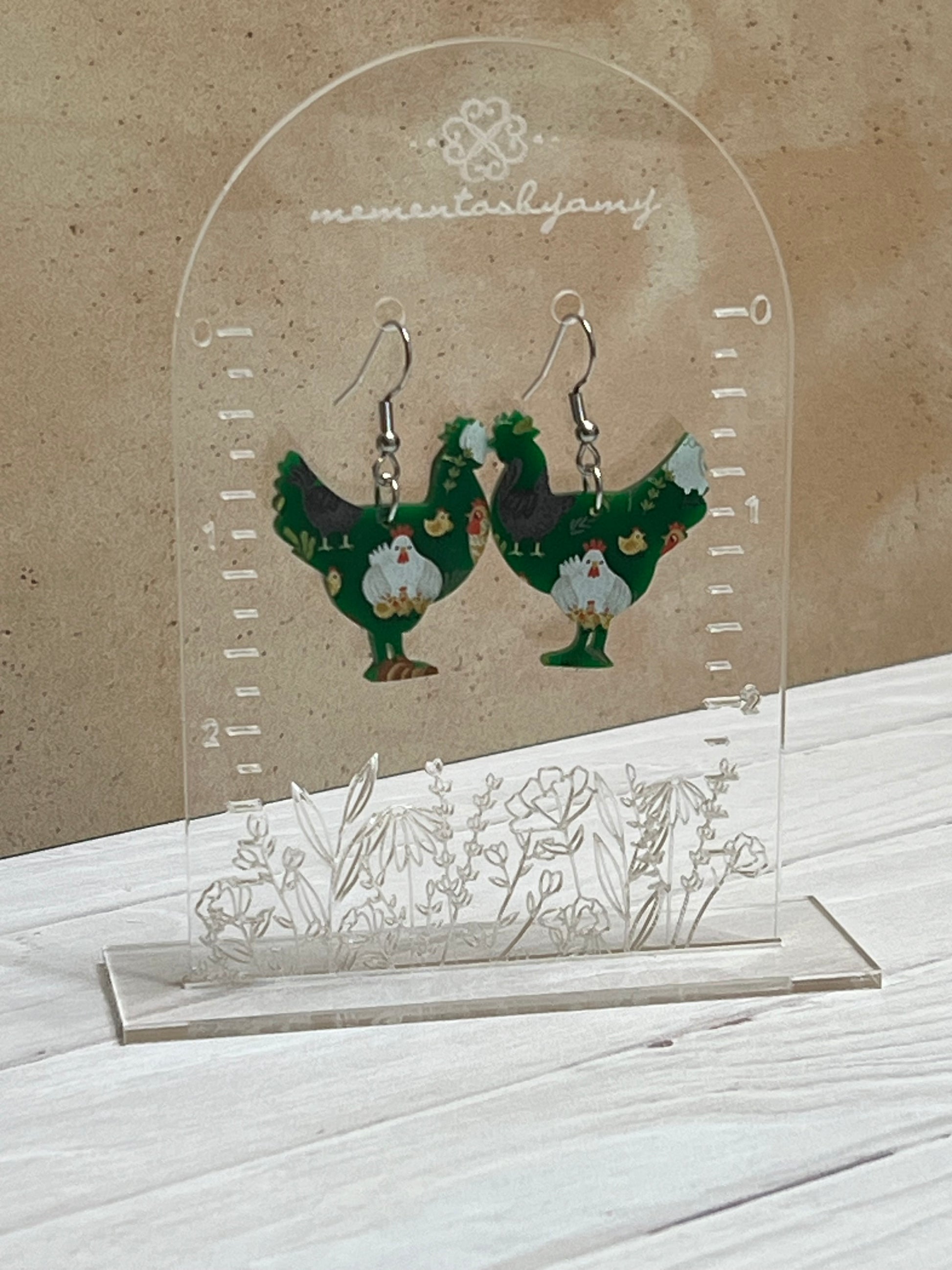 These green chicken silhouette dangle earrings add a playful and quirky flair to any outfit. Lightweight and charming, they’re perfect for chicken enthusiasts or anyone looking to brighten their day with a fun accessory.