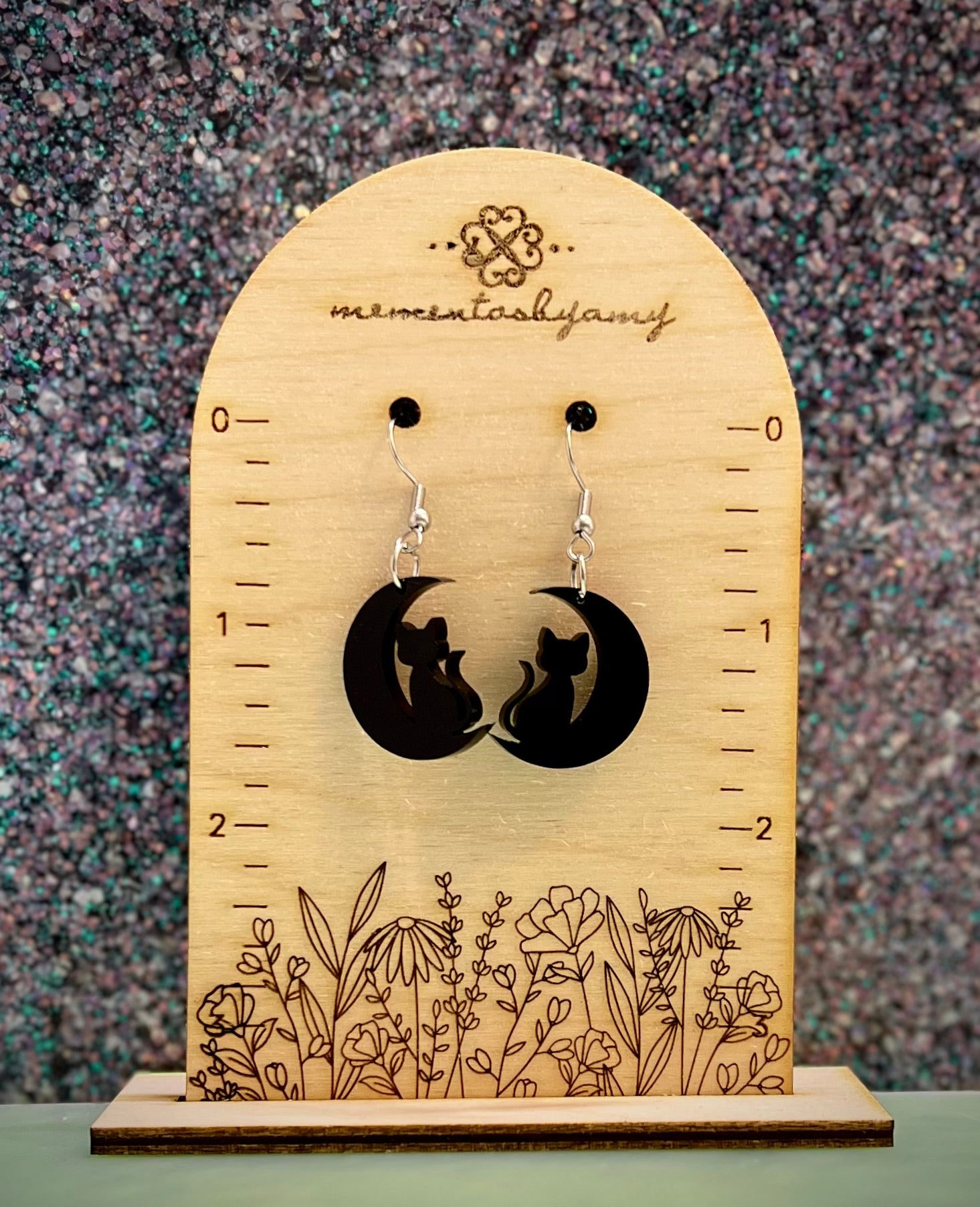 A little silhouette-o of a kitty sitting in the moon. Crafted with black acrylic and stainless steel ear wires.