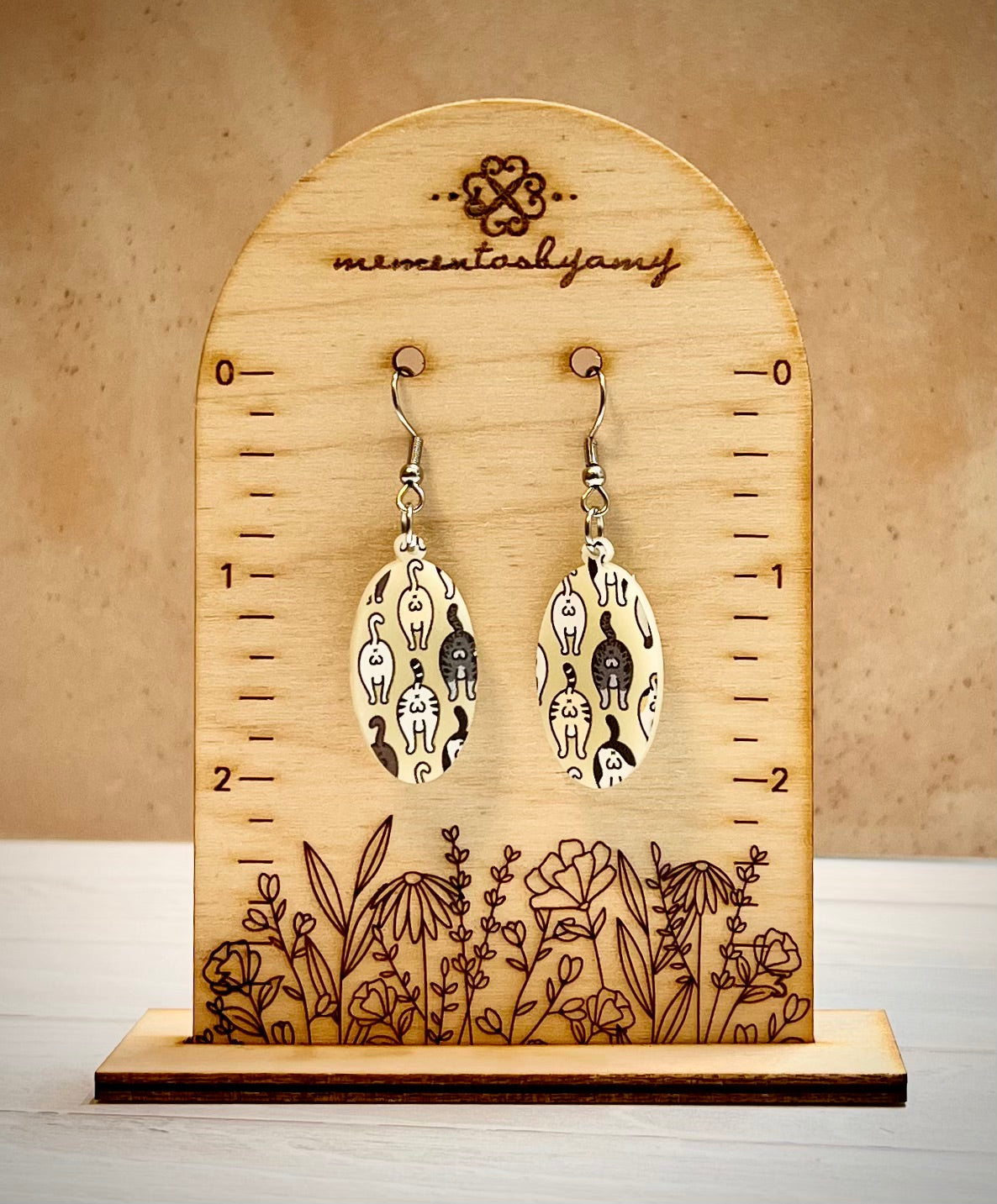 These quirky earrings feature small oval shapes and a playful ivory background adorned with adorable cat butts. Perfect for those who don't take themselves too seriously, these earrings add a touch of humor to any outfit. Meow-velous accessory for any cat lover! (Meow or never!)