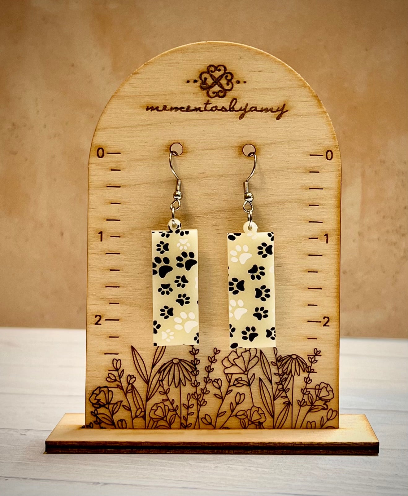 Show off your playful side with these unique rectangular dangle acrylic earrings. The ivory background is adorned with adorable black and white paw prints, making them the perfect accessory for any animal lover. Dress up any outfit with a little "paws"!