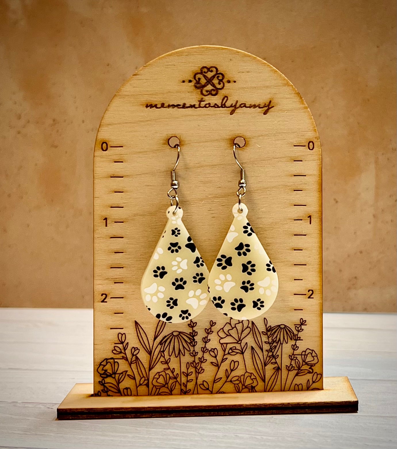 Add a touch of whimsy to your style with these teardrop shape dangle acrylic earrings featuring a cute paw print design on an ivory background. Perfect for animal lovers and those looking for a fun accessory. Meow!
