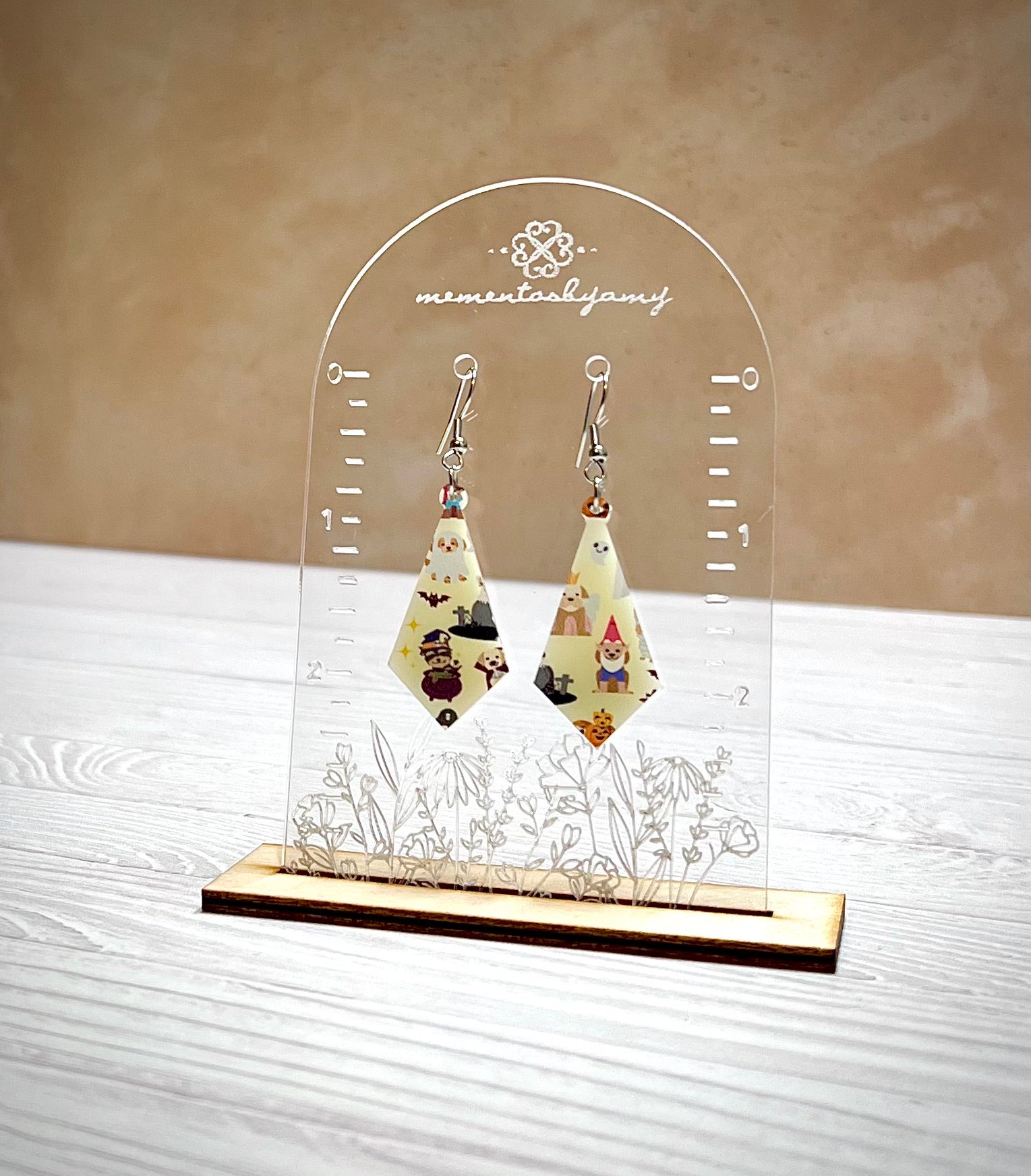 Get into the Halloween spirit with our playful and unique kite-shaped earrings featuring adorable dogs in costume! Made from lightweight acrylic, these earrings are the perfect accessory to complete your festive holiday look. Woof-tastic!