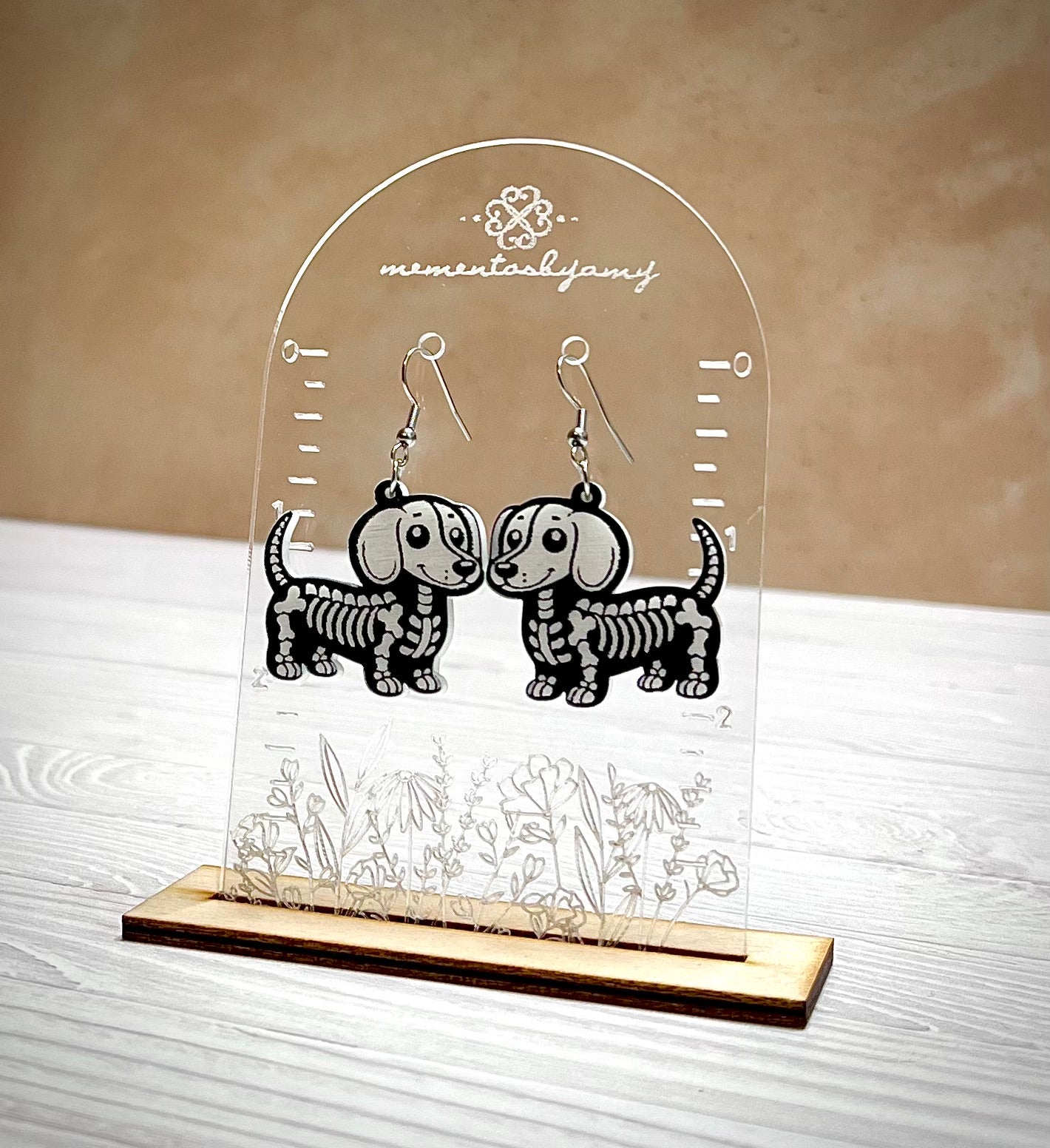 Unleash your spooky style with these Dachshund Skellie Earrings. Made of acrylic, these earrings feature a quirky dachshund skeleton design that will add some personality to any outfit. Perfect for dog lovers with a sense of humor!
